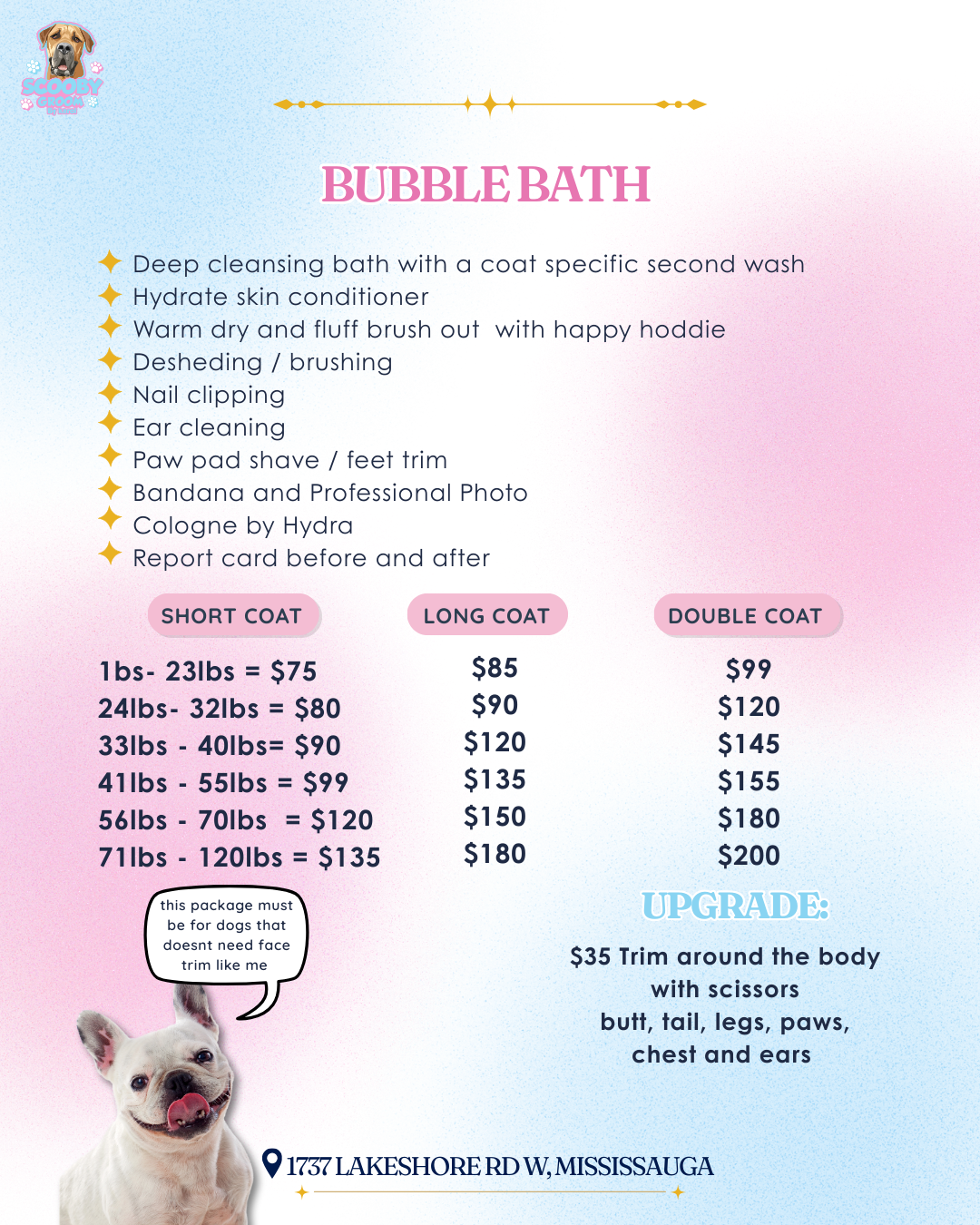 I deeply understand the fear many of us feel when leaving our dogs in the hands of strangers. I’ve been there myself. I visited many places in Toronto, and it made me anxious not to see what they were doing with my dogs, not to know who was caring for them, not knowing if they were okay. That feeling created anxiety and distrust in me.That’s why, at Scooby Groom, everything is transparent. If you wish, you can observe the entire grooming process of your pet. We have nothing to hide —only a lot to care for.